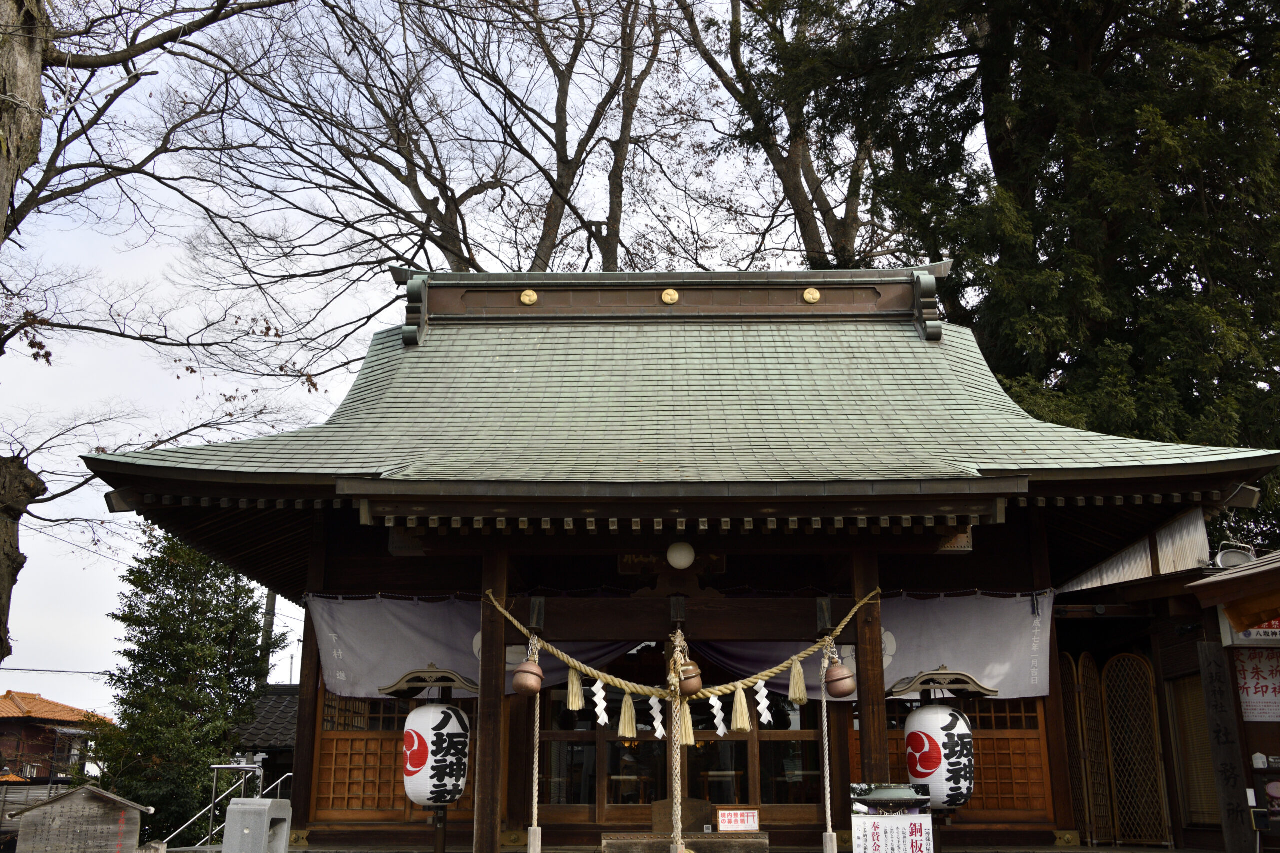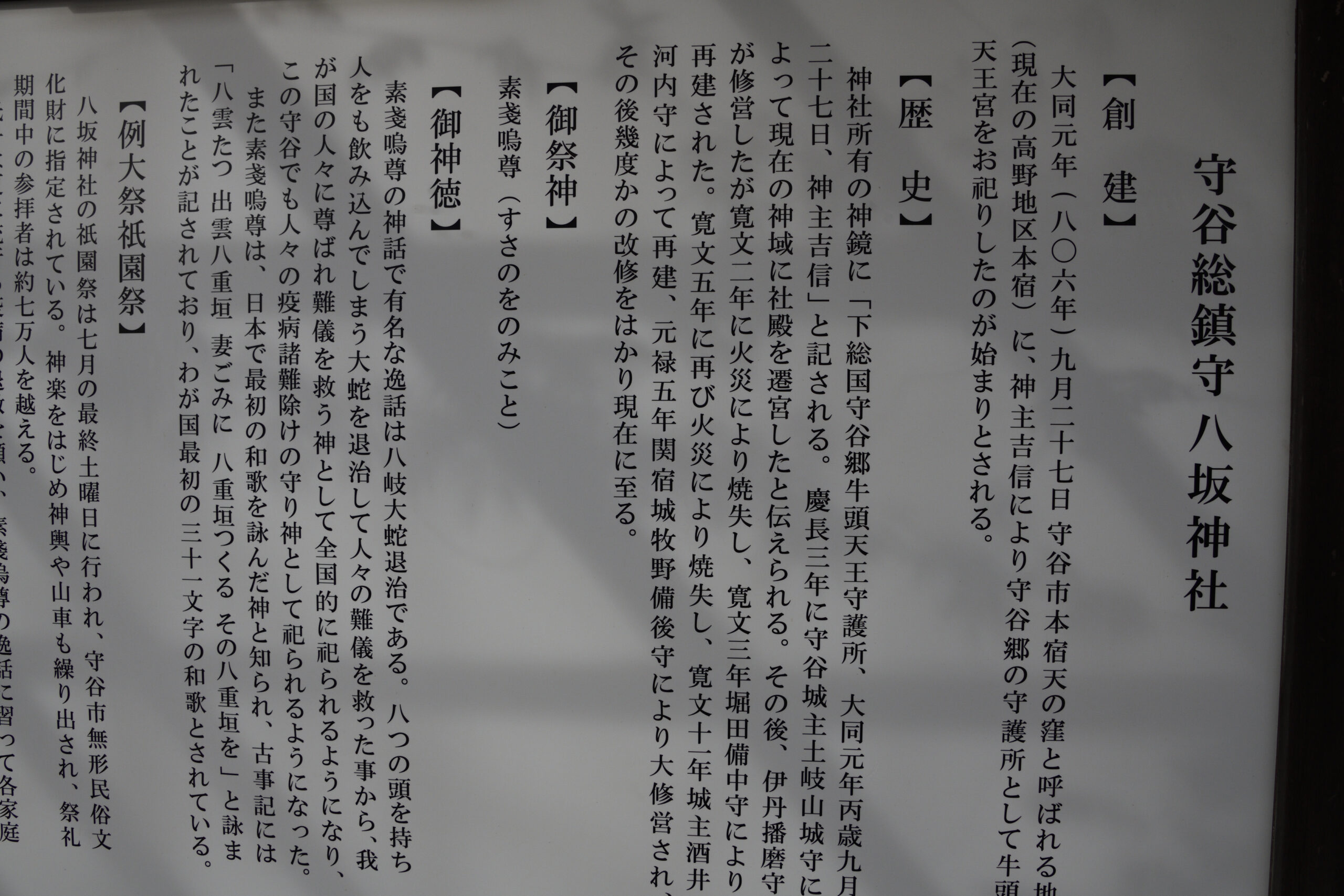 八坂神社は守谷総鎮守です。樹齢数百年ともいわれるイチョウの木と鳥居をくぐると、樹齢400年ともいわれるケヤキの木の下に守谷八景の「八坂神社蝉時雨」の石碑があります。祭神は牛頭天王(すさのをのみこと)です。明治時代に八坂神社と改名しました。当時はセミの鳴き声がさぞう騒がしかったことでしょう。