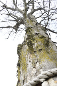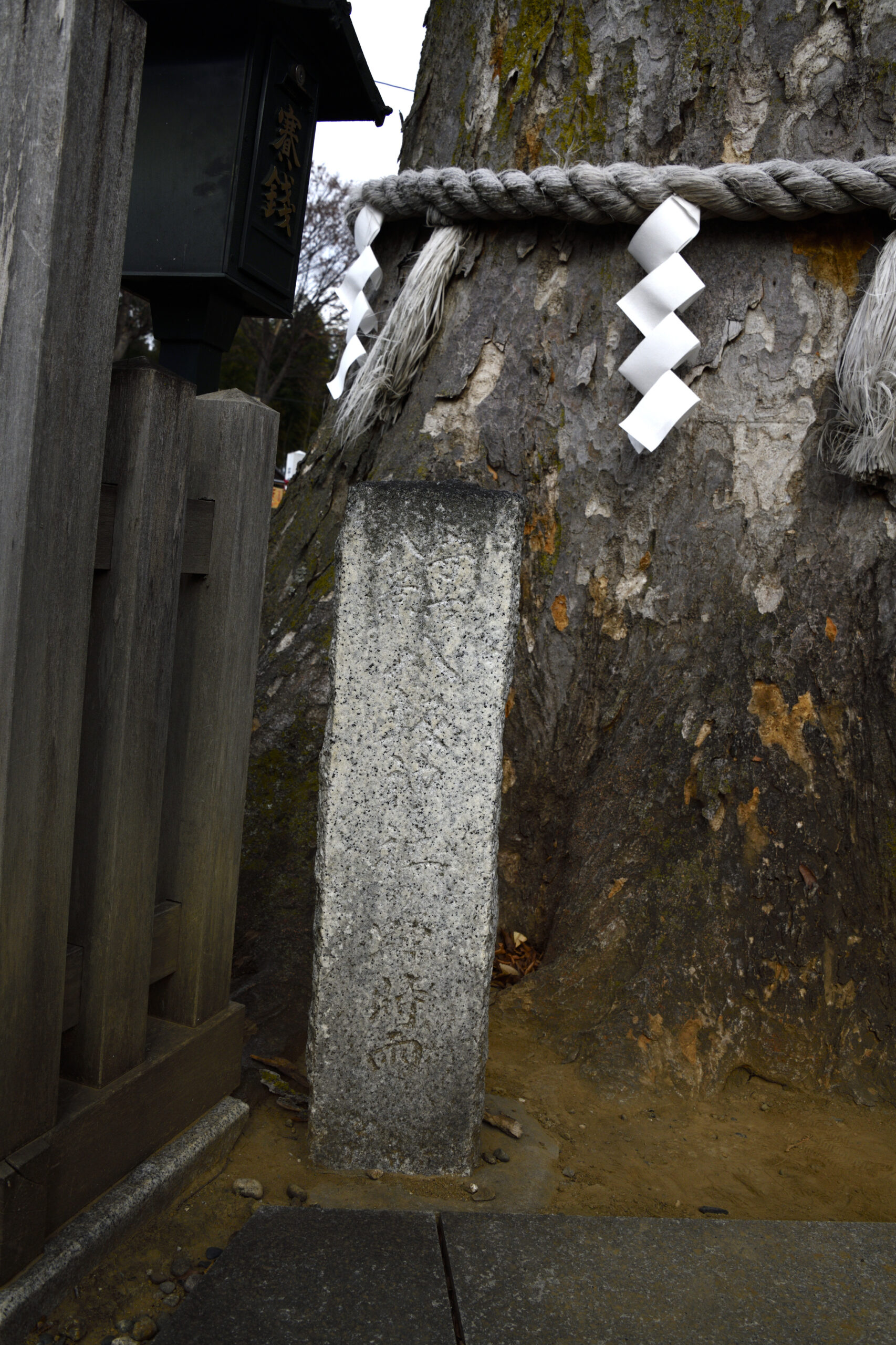 樹齢400年ともいわれるケヤキの巨木とその石碑