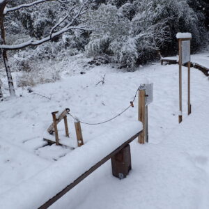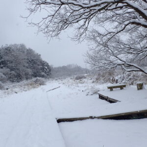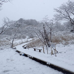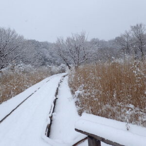 守谷で雪が降り、積もるのも珍しいことなので「とりの道」を散歩してきました。時より風が吹き抜け雪を舞散らしている寒い日でした。木々の枝には雪が重なり、忍耐強く静かに立ち尽くし春を待っているようです。「とりの道」の歩道は分厚い雪に覆われ、雪の感触を確かめながら静謐な白と黒の世界を味わって来ました。(守谷市本町、2月8日)